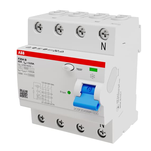 Wyłącznik różnicowo-prądowy serii F200 typ (wykrywany kształt fali prądu upływowego) A, prąd , znamionowy In 25A, znamionowy prąd różnicowy I*n 0,03 A.